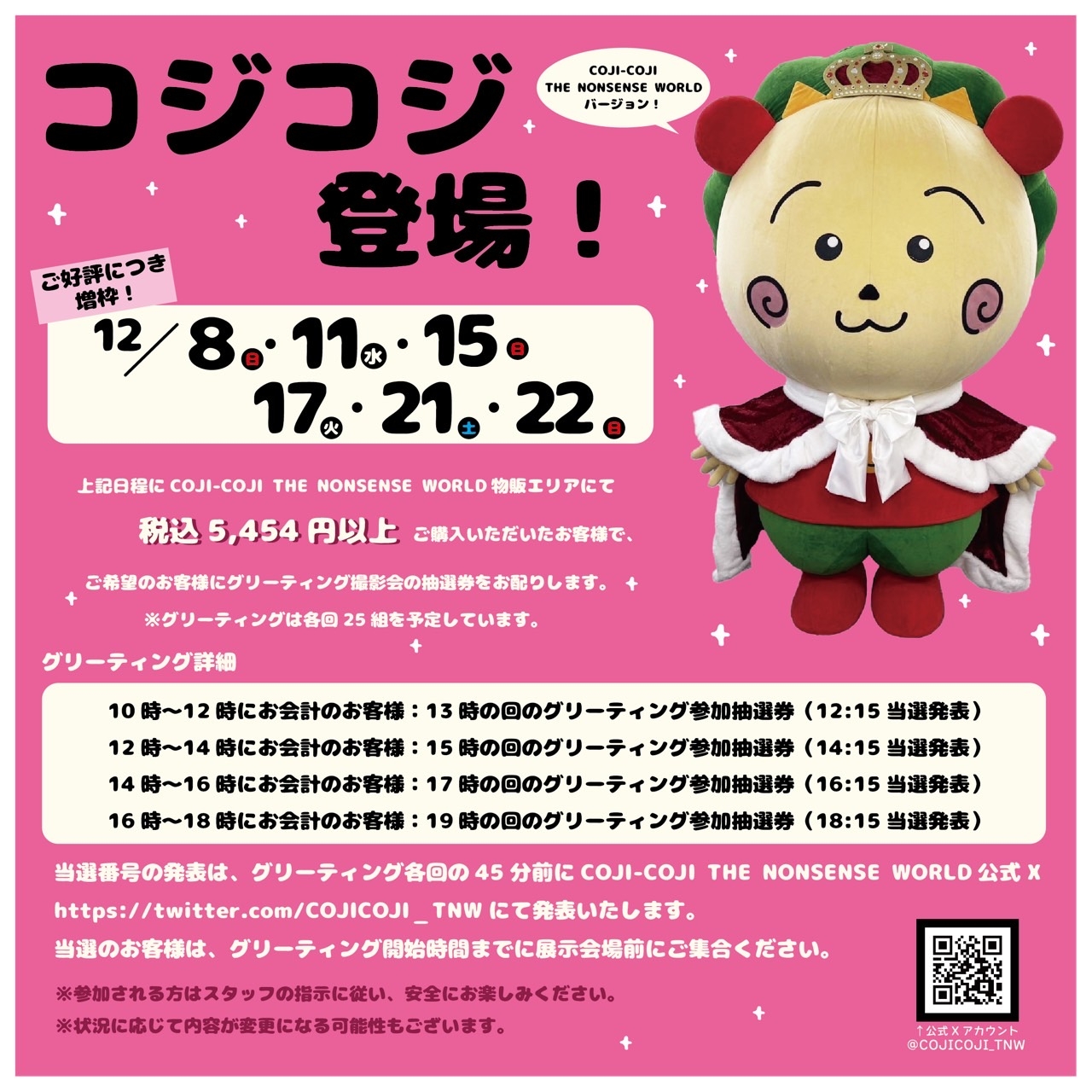 当選番号の発表は、グリーティング各回の45分前に「COJI-COJI THE NONSENSE WORLD」公式X( https://x.com/COJICOJI_TNW )にて発表いたします。