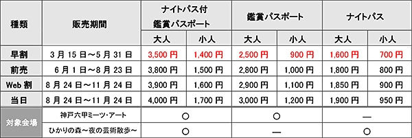 また本芸術祭開催にあたり、3月15日(金)~5月31日(金)の期間、通常価格よりも大変お得な「ナイトパス付鑑賞パスポート」「鑑賞パスポート」の早割価格での販売を再開します。さらに、「ひかりの森~夜の芸術散歩~」を鑑賞できる「ナイトパス」もWEBにて早割価格で販売を開始します。