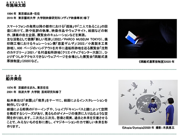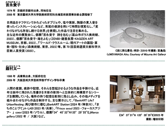 いくらまりえ、ウ・ヒョンミン、小畑亮平、開発好明、金氏徹平、川俣正、北川太郎、城戸みゆき、佐藤圭一、さわひらき、鈴木将弘、高田治、高橋匡太(※1)、高橋瑠璃(※1)、生田目礼一、春田美咲、布施琳太郎、船井美佐、松田修、三梨伸、宮永愛子、葭村太一、WA!moto.“Motoka Watanabe”(2024年3月15日現在)