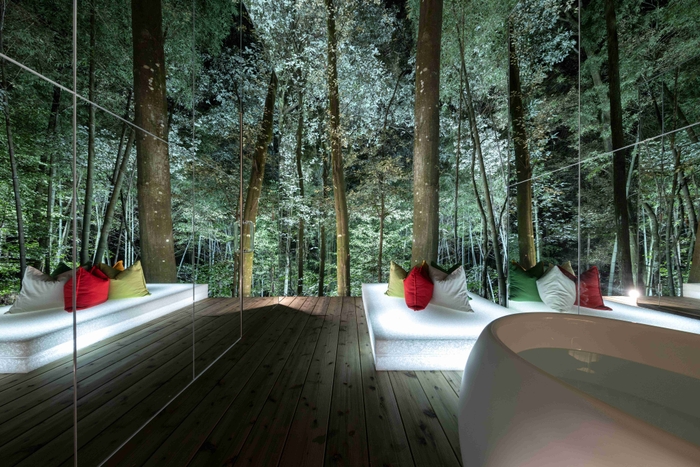 寝心地を追求したライトウェーブ整いベッド。鏡に囲まれた空間に身を委ねれば、360度に広がる森の絶景と一体に。