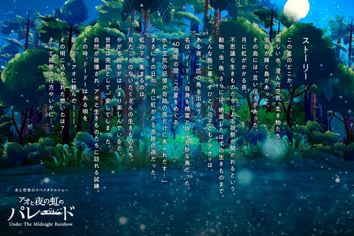 このショーは「水」と「空気」、そして「生命(いのち)」がつながり、めぐっていく祝祭の物語をコンセプトとしています。