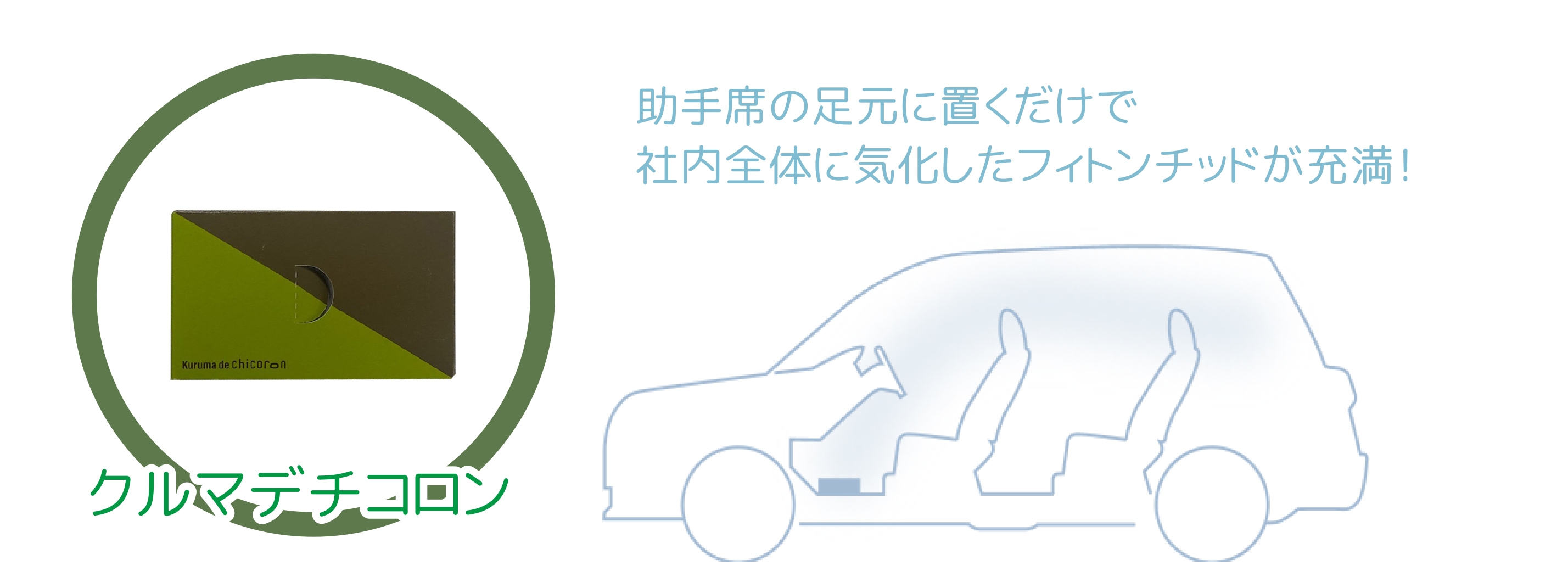 クルマデチコロンは、車のエアコン吸気口(内気循環の吸気口)に取り付ける事でその送風力を利用し、成分を車内空間中に拡散させます。そのため車内空間を全て除菌・消臭・芳香ができます。また、エアコンの吸気口に取り付けフィルターを通す事でエアコン内部の除菌、消臭もできます。車内はどうしても狭い密閉空間になってしまう機会が増えてしまいますので、クルマデチコロンを取り付けておけば、複数人での移動でも安心です。