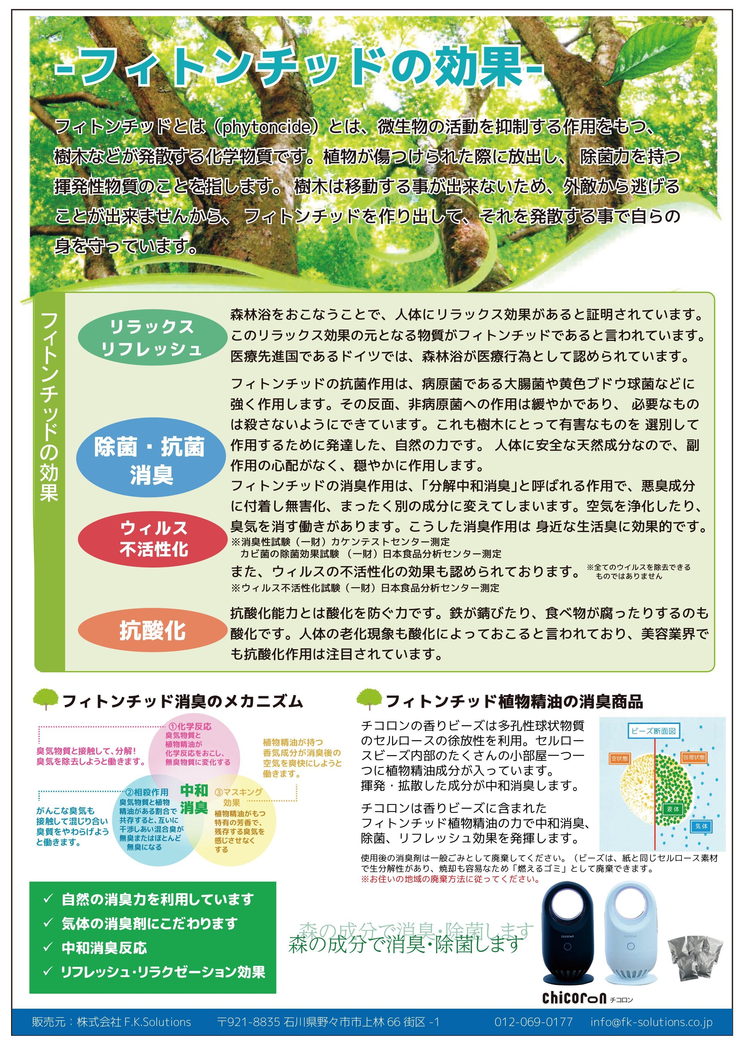 株式会社F.K.Solutions(本社:石川県野々市市、代表取締役:岡田 浩幸)はこの度、除菌、消臭、芳香が一度にできる「チコロン」シリーズを発売いたします。