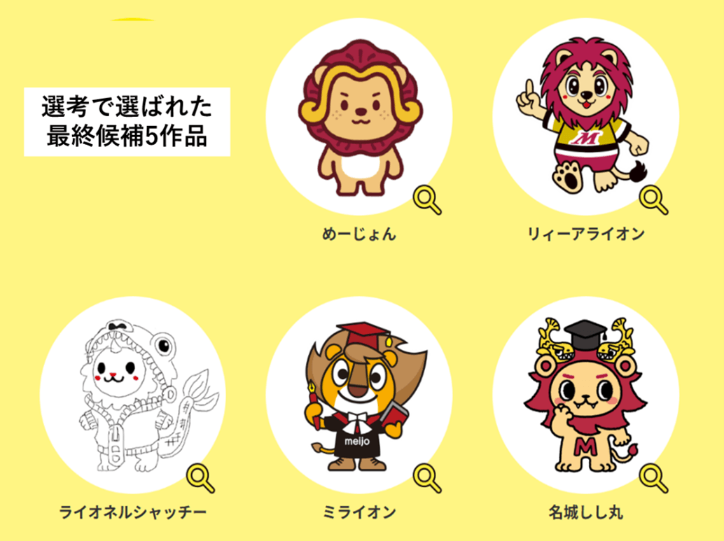 最終候補となった5作品から、名城大学の新しいマスコットキャラクターを皆様の投票で決定します。多くの方々のご参加をお待ちしています。