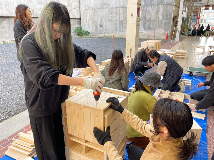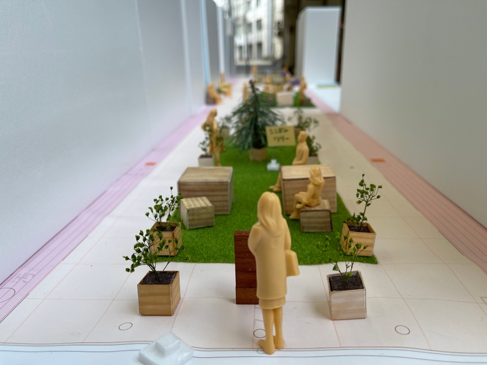 全長約50メートルの一番街を3つのゾーンに分け、ワークショップの参加者で作ったストリートファニチャーや芝生エリア、植栽などを配置した道路空間を作って、回遊性や通行、滞在の質が向上されたかどうかの調査を行います。