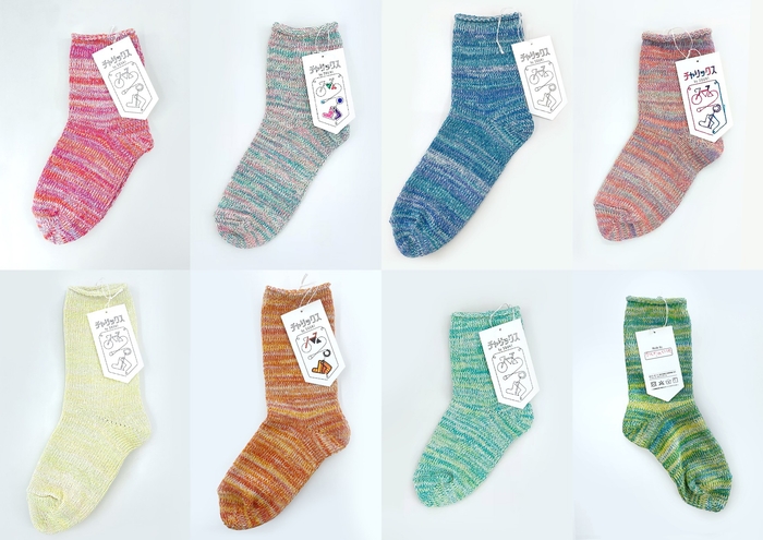 「チャリックス」は創喜が開発した、自転車を漕ぐ力を使って靴下を編むことができるオリジナルマシーンです。12〜36色の糸から3色を選び、好みのサイズと丈を選択したのち、10分~15分ほど自転車を漕ぐと靴下が編みあがります。編みあがった靴下はスタッフがその場でつま先の縫製と温風で仕上げを施し、最後に利用者がタグに自分の名前を記入して完成。靴下の製造工程の一連を体験しながら、自分だけの靴下をつくることができます。出来上がった靴下はローゲージの大きな編み目が特徴で、肉厚でふっくらとした履き心地が楽しめます。