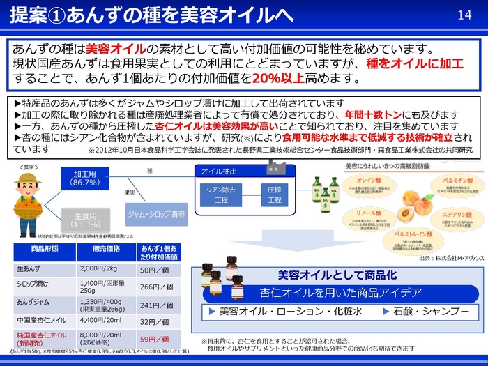 岸江「長野県工業技術総合センターの方がシアン化合物の除去技術について論文 を発表されたときも、最初は食用として使うために申請を出したそうです。でも却下されてしまい、『もうだめなんだ』という諦めムードがありました。ところが、杏仁オイルというのは実は雑貨扱いであり食品ではないんですね。雑貨扱いであれば活用ができるということで、こういったアイデアになりました。」