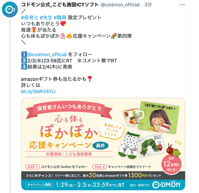保育園・幼稚園・学童・スクール・小学校などの、こども施設で働く先生の毎日をサポートするICTシステム「CoDMON(以下コドモン)」を提供する株式会社コドモン(本社:東京都港区、代表取締役:小池義則)は、エッセンシャルワーカーであるこども施設の職員のみなさまに日頃の感謝を伝え応援する、Twitterのフォロー&RTキャンペーンを実施することをお知らせします。