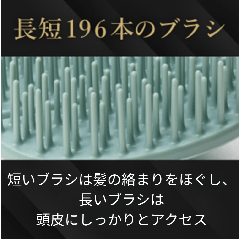 また、長短196本ものブラシが、頭皮に心地よい刺激を与える。短いブラシが髪の絡まりをほぐし、長いブラシが頭皮にしっかりとアクセスする。