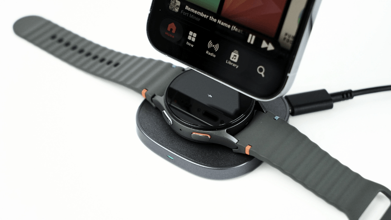 にもかかわらず、デバイス2台を同時に急速充電できるパワフルさを実現。iPhoneだけでなく、Apple Watch、AirPodsといったウェアラブルデバイスにも対応し、「置くだけ」で同時にすべてを充電できるオールインワンの最新充電器です。