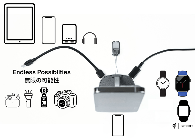 外出先でも家庭でも、ケーブルの取り合いや場所を取る心配は不要。これ1台で全デバイスをまとめて充電できます。