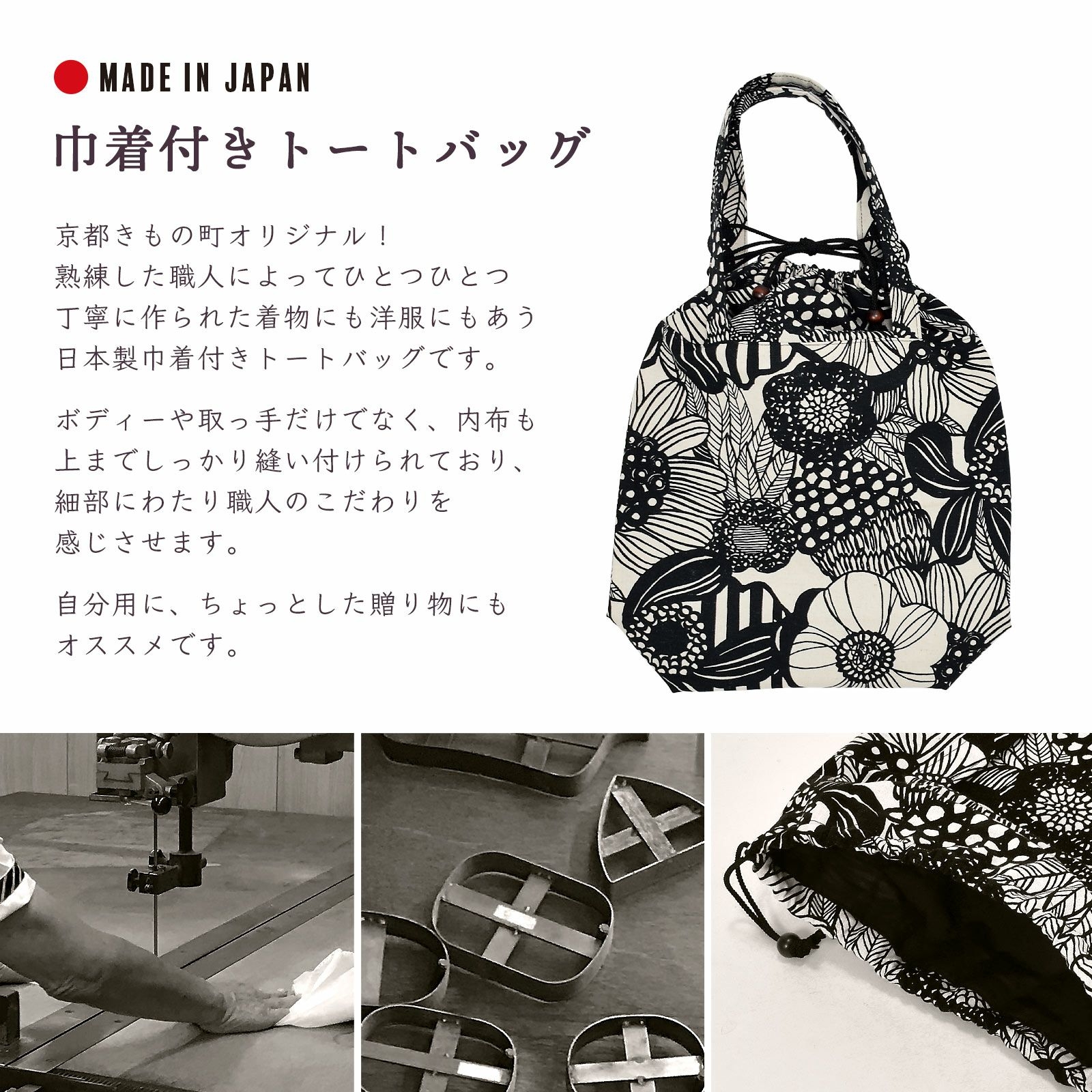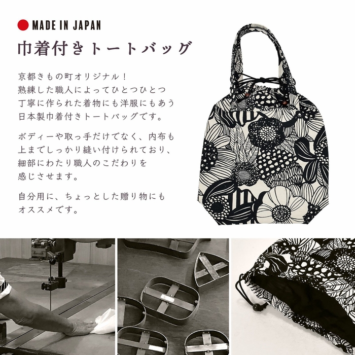 熟練した職人によってひとつひとつ丁寧に作られた、着物にも洋服にもあう日本製巾着付きトートバッグです。ボディーや取っ手だけでなく、内布も上までしっかり縫い付けられており、細部にわたり職人のこだわりを感じさせます。自分用に、ちょっとした贈り物にもオススメです。