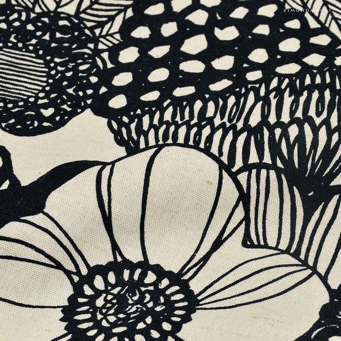 生成り地に黒色のレトロな花柄が目を惹きます。北欧風のデザインは、洋服だけでなく、カジュアルな小紋の着物にもよく合います。コーディネートのアクセントにもなるので、ご自分用に。また、贈り物としてもオススメです。