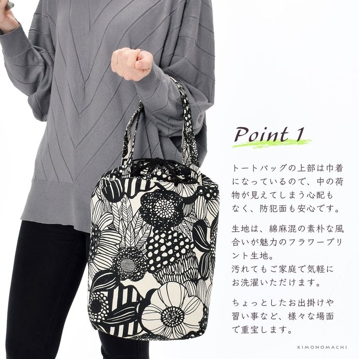 トートバッグの上部は巾着になっているので、中の荷物が見えてしまう心配もなく、防犯面も安心です。生地は、綿麻混の素朴な風合いが魅力のフラワープリント生地。汚れてもご家庭で気軽にお洗濯いただけます。ちょっとしたお出掛けや習い事用のレッスンバッグなど、様々な場面で重宝します。