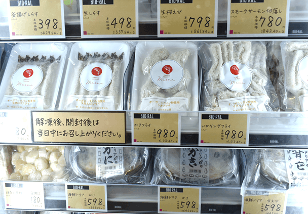 水産冷凍コーナーでは、食品添加物に配慮した商品などを品ぞろえしています。オーガニックパン粉を使用した天然えび・かき・いかリングフライを新規導入しました。