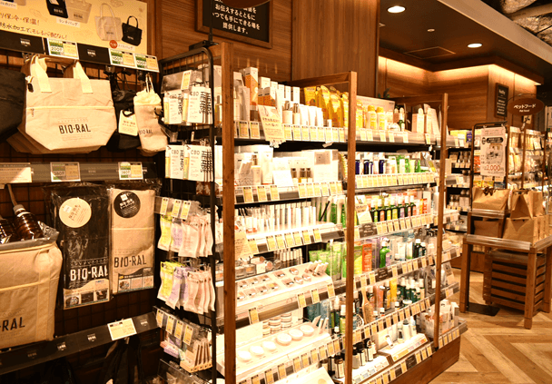 ビオラルは食品だけではありません!オーガニック植物エキスを配合したコスメや自然由来の成分で作られたシャンプー、環境にやさしい洗剤など、環境に配慮した商品が多数並びます。