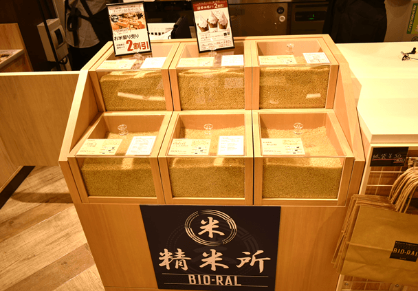 お好きな量をお好みの精米具合でご提供するお米量り売りコーナー。常時6種類のお米をご用意しています。