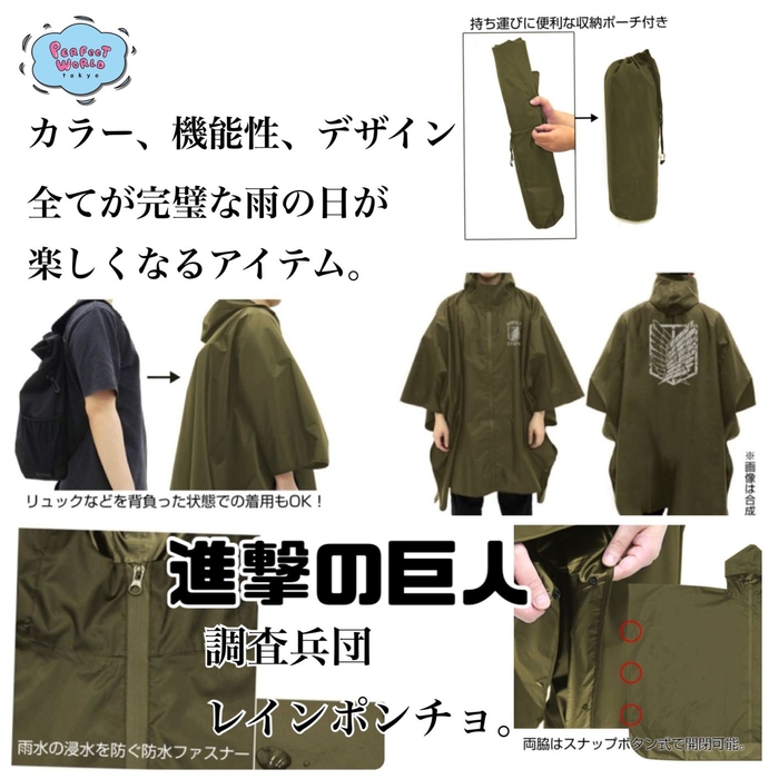 雨の日に調査兵団になれる”進撃の巨人レインポンチョ”カラー・機能性・シンプルかっこいいデザイン、すべてが完璧な雨の日が楽しくなるアイテム。
