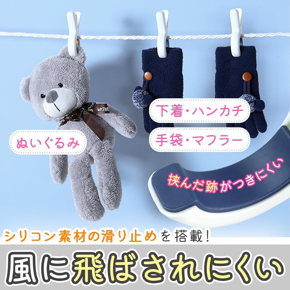 シリコン素材の滑り止めを搭載したこの洗濯バサミは、物干し竿やロープにしっかりと固定され、風に飛ばされにくい設計です。挟んだ跡がつきにくいため、デリケートな素材の衣類にも安心してお使いいただけます。