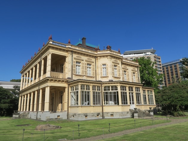 国指定重要文化財。三菱財閥創設者岩崎彌太郎の長男で、第3代社長の岩崎久彌の邸宅として、明治29(1896)年に竣工しました。往時は15,000坪の敷地に、20棟以上の建物が立ち並んでいましたが、現在は3分の1の敷地面積となり、ジョサイア・コンドル設計の洋館と撞球室、名棟梁大河喜十郎が手がけたといわれる和館大広間の3棟が残っています。