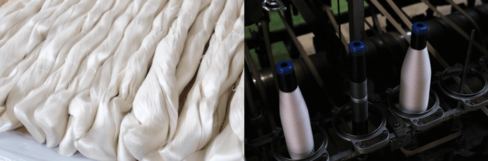 絹は繭(まゆ)から引き出した糸でできています。繭は蚕(かいこ)という昆虫が蛹(さなぎ)になるときに、自分の口から吐いて作る小さな家です。蚕は糸を吐き始めてから吐き終えるまで途切れることのない一本の糸で繭を作ります。その長さは千数百メートルにもなるといわれています。絹糸独特の光沢は繊維の断面の形が三角形をしていることで光を反射しやすくなっており、絹糸独特の優雅な光沢が生まれています。
