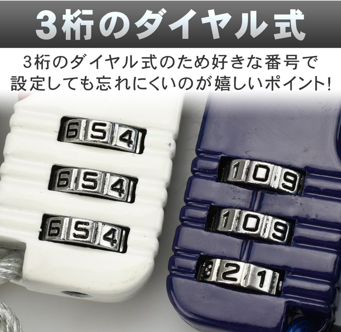 ダイヤルワイヤーロックは3桁の暗証番号を自由に設定できます。自分以外は開けられない仕組みなので見た目以上の防犯性の高さがポイントです。さらにダイヤル式により、施錠/開錠する際に鍵が要らないため紛失する心配がありません。