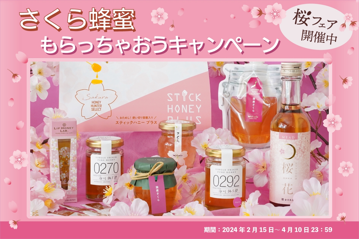 概要:暖かな春をひとあし先に感じられる「桜フェア」を開催。産地別のさくら蜂蜜が使い切りサイズでセットになった「スティックハニープラス さくら」や、桜の花びらを蜂蜜に閉じ込めたピンクで可愛い「桜花びら入り蜂蜜」、受験生にプレゼントしたい「LIP HONEY LAB. サクラ、サク」など、さくら蜂蜜アイテムが勢ぞろい。さらに、フェア期間中対象商品を1点購入ごとに「スティックハニープラス 国産さくら蜂蜜(8g)」を1本プレゼント。