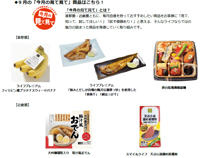 ライフが自信を持っておすすめする「今月の見て見て」の首都圏9月商品に選ばれた「秋の味覚満載御膳」は、かきフライに昨年の約1.5倍の大きさの広島県産の大粒かきを使用。なめこの天ぷらは表面はカリッと中はジューシーな食感が味わえる製法へ変更したほか、舞茸ごはんには銀杏を添えて秋らしさをより感じていただけるよう仕上げました。また、容器を昨年の6マスから9マスに変更したことで、お楽しみいただけるおかずが増えて食べ応え抜群です。