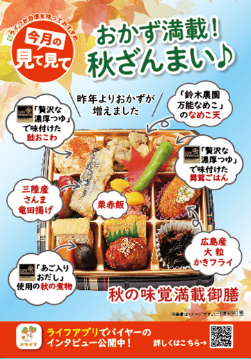 “おいしい” “ワクワク” “ハッピー” をお届けするライフコーポレーションは、昨年9月に期間限定で販売しご好評をいただいた「秋の味覚満載御膳」をリニューアルし、首都圏店舗にて10月末までの期間限定で販売しております。