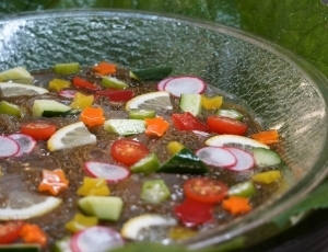 スズキを冷しゃぶにし、たっぷりの野菜と盛り合わせました。その上に、伊豆のお味噌とバルサミコ酢を合 わせたオリジナルジュレ・ドレッングをかけています。