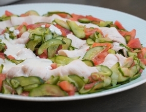 2、「胡瓜もみと富士の国ポーク冷しゃぶ山葵漬けクリーム掛け」