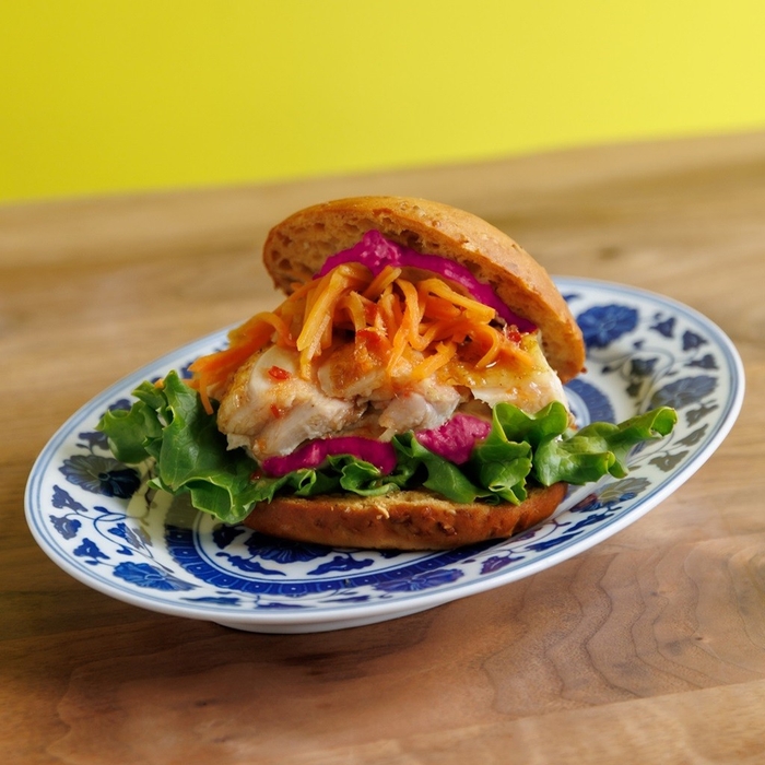 「ZENBブレッド 3種の雑穀」使用。ココナッツやスパイスと漬け込んで香ばしく焼き上げたチキンをベースに、ビーツで色付けしたフムスや野菜をたっぷりサンドしました。