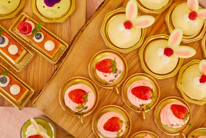 物語の中に登場する「白薔薇」をモチーフとしたロールケーキや、三月うさぎのホワイトチョコムース、ひよこのシュークリーム、ハートの苺ムース等、春の花々やイースターエッグ、うさぎやひよこをモチーフとした色鮮やかなスイーツと軽食をお好きなだけご堪能いただけます。