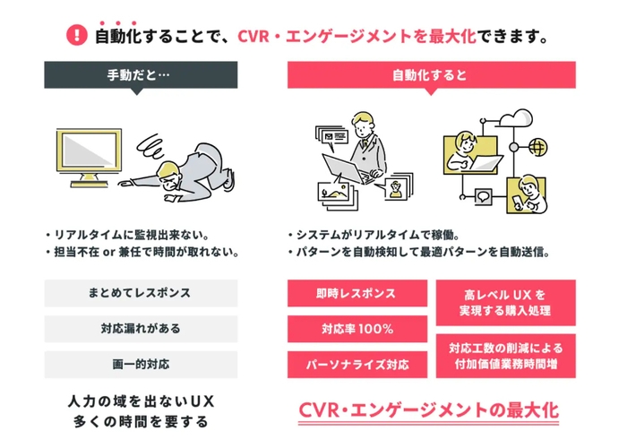 これにより今まで膨大にかかっていたユーザーコミュニケーションの工数が大幅に削減でき、これまで着手できなかった新規顧客獲得のための施策なども積極的に行えるようになるため、Instagram集客目標の達成、売上の向上が見込めます。