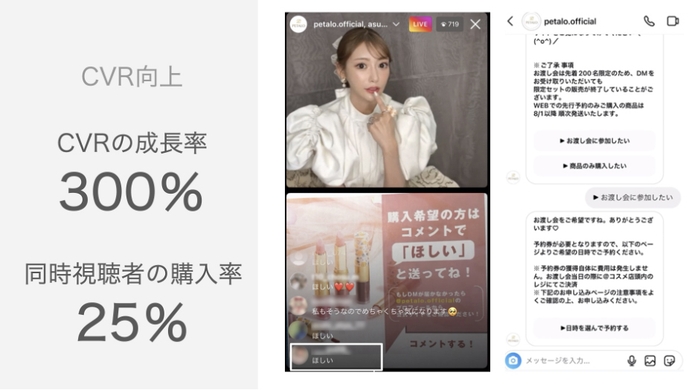 Instagramライブ中に商品を紹介した際、視聴者が「ほしい」とコメントすることで、自動的にユーザーのDMに該当商品の購入URLが送信される施策を実施。