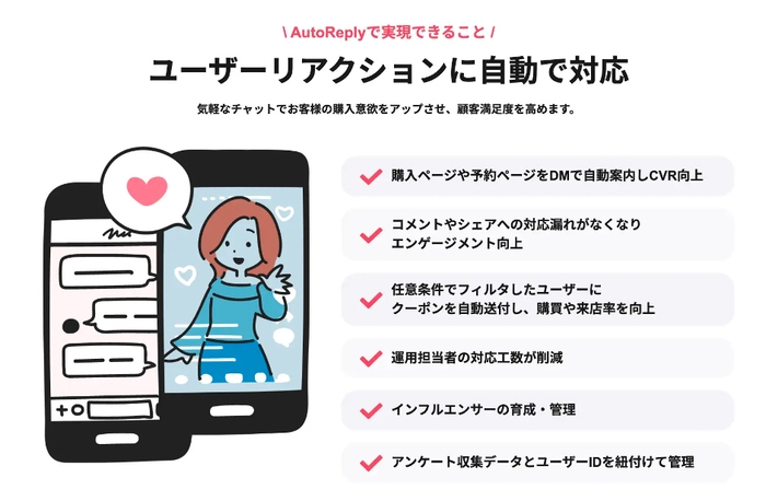 AutoReplyのツールでは、コメントやメンションなどのユーザーからのアクションに対して任意に設定したDMを自動で送信することができ、その後の対応も自動化することができます。