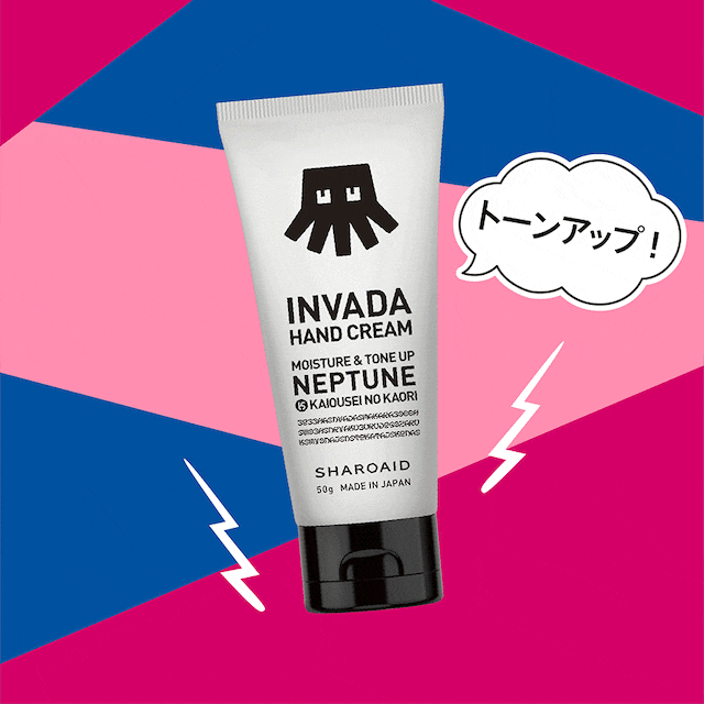 高保湿効果が期待できる北海道産ガゴメ抽出成分に、こだわりの美容成分を加えしっかり丁寧に纏め上げたハンドクリーム。そこに機能性と快適性だけでなく、楽しいギミックをプラスしたINVADA HAND CREAM シリーズ。ベタつきを抑えたさっぱりタイプのMERCURYと、お肌を明るくメイクするトーンアップタイプのNEPTUNEの2種が、ユニークなキャラクターアイコンを伴って新登場。