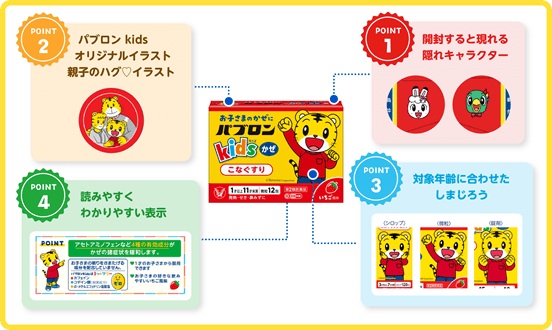 パッケージでは、しまじろうや仲間たちが、そばで見守ってくれるような気持ちになれるように、全面にイラストを取り入れ、かぜをひいたお子さまがかぜ薬を服用する抵抗感が少なくなるように工夫しました。