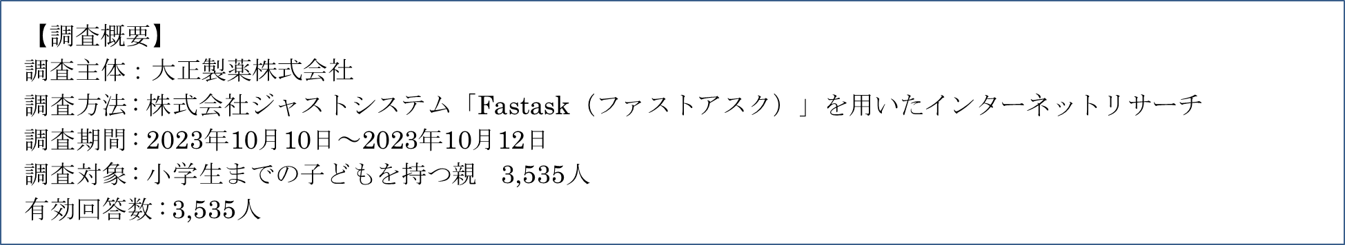 新型コロナウイルス感染症の5類感染症移行後、子どものかぜ症状が急増しているといった声が聞かれます。当社が実施した小学生までのお子さまがいらっしゃる大人の方3,535人を対象にした調査でも、「コロナ禍を経て子どもの健康状態が今までより心配になった」と回答された方は約7割、また「コロナ禍を経て子どもがかぜの症状が出た時に、どう対処したらよいかわからなくなった」と回答した方は約半数に上りました。