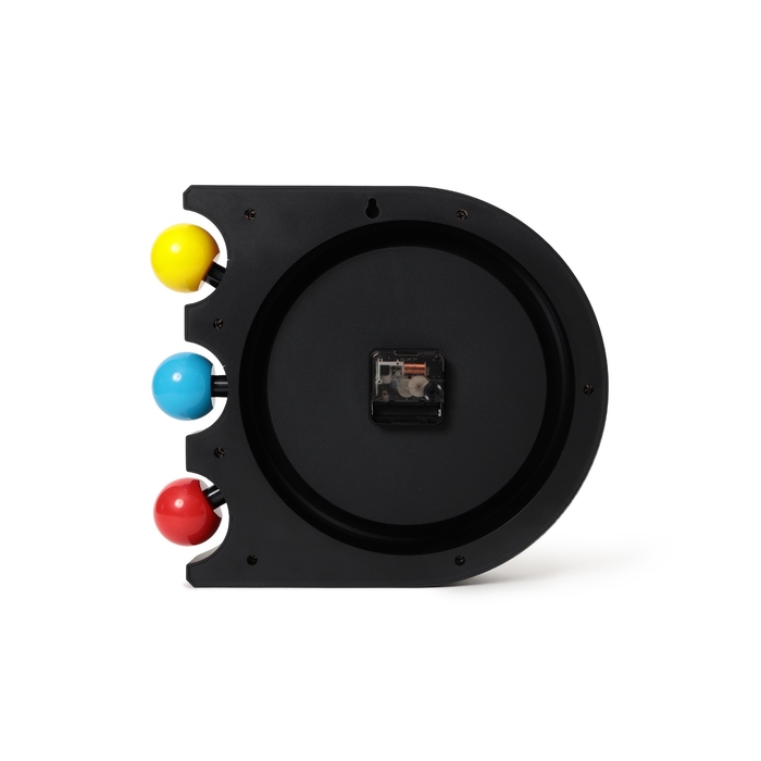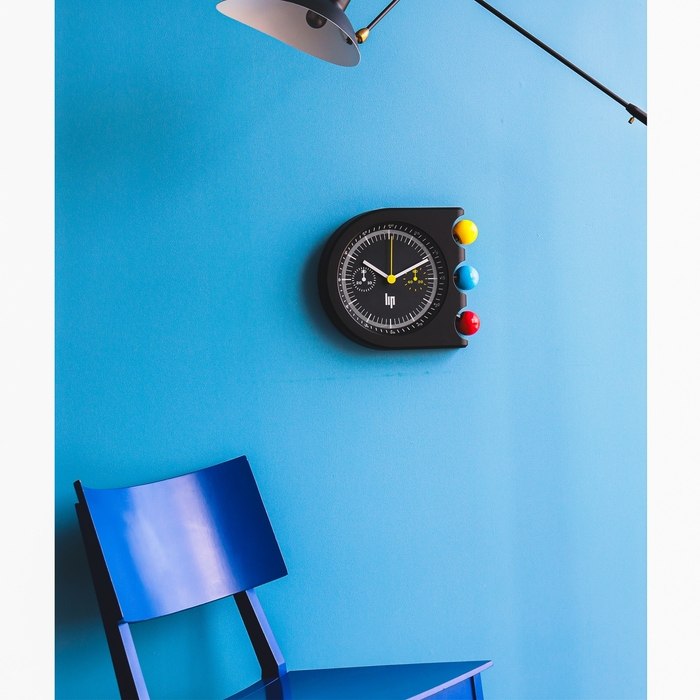 象徴的な黄・青・赤の球体は、腕時計におけるクロノグラフボタンから“時を彩るリズムパーツ”へと進化し、壁面に鮮やかなアクセントを添えます。