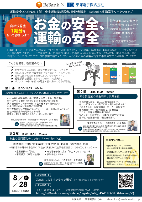 アルコール検知システム、 IT点呼システム、 運行管理システムを開発・販売する東海電子株式会社(本社:静岡県富士市 代表取締役 杉本 哲也)は、 この度、 株式会社ReBank(本社:東京都千代田区 代表取締役 文野 成信)とのオンラインワークショップ『【中小運輸業経営者・後継者限定】ReBank✕東海電子ワークショップ「お金の安全、運輸の安全」』を8月28日(水)に無料開催いたします。