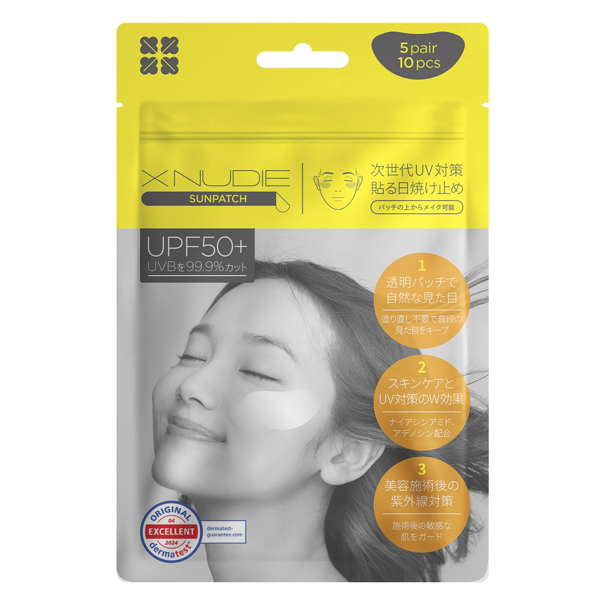 「XNUDIE サンパッチクリア」は、「貼る」と言う新しい概念を取り入れた次世代UVケア商品であり、この1枚でUVカット、スキンケア、シミカバーの1枚3役を可能とします。美容成分を配合した物理的なバリアで紫外線を33.3%カット(UPF50+ ※UV-Bを99.9%、UV-Aを94.8%ブロック)します。装着部位の保湿、ケアを同時に対応することで、UVカットとスキンケアを同時に実現し一日中お肌を快適な環境で守ります。また装着後、通常通りのメイクが可能な為、普段と変わらない見た目もキープすることが可能です。