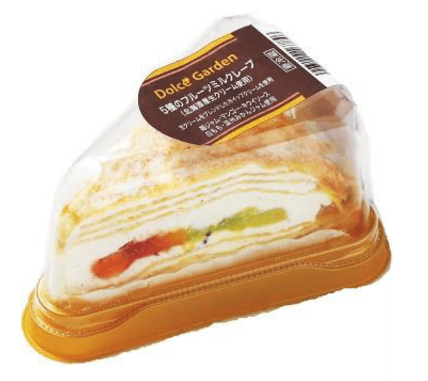 “ミルクレープ”とは、薄いクレープ生地の間にクリームや果物などを交互に挟み、幾層にも重なった断面が目を引くケーキです。5種のフルーツ(マンゴーダイス・温州みかんジャム・白桃ダイス・いちごジャム・キウイソース)を使用し、北海道産生クリームのほのかな甘味とフルーツの酸味のバランスが絶妙です。