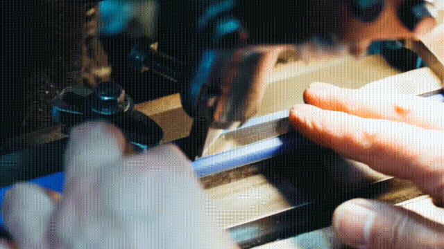 吉田ヤスリの“目立て”は、専用の鏨(たがね)を用いて斜めに溝を刻む技術。