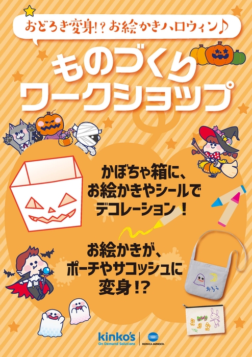 当社は、イベントで使われるフォトブース、その他誘導ツールを提供します。また、イベント当日には、かぼちゃ箱のワークショップ、そして描いた絵をポーチやサコッシュにプリントし、グッズが自宅に届くワークショップを開催します。