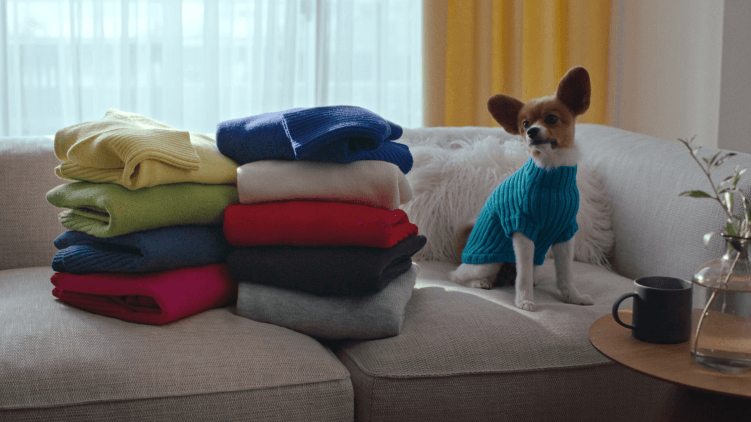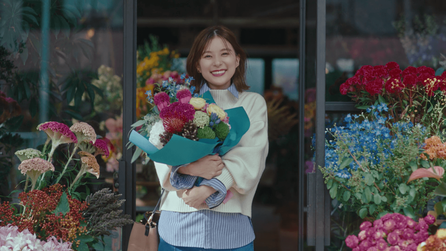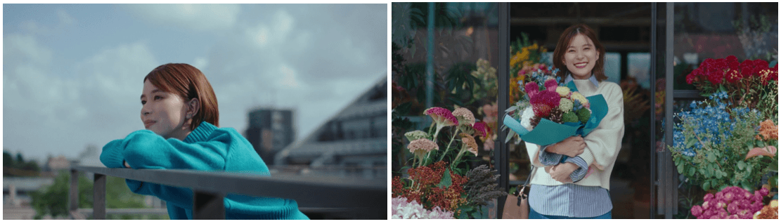 社会人の芳根さんは毎日仕事で大忙し。友達と遊びに出かける時間も取れず、浮かない表情を見せます。そんな中、気分を一新すべく新しい服を購入。袋から鮮やかなブルーのニットを取り出し、着てみると、暗かった表情がはじけるような笑顔に一変します。ピンクのニットを着て軽やかな足取りで街に飛び出し、ショーウィンドウに映る自身の姿を見て嬉しそうに微笑んだり、赤のニットを着て友達と写真を撮ったり、キナリのニットを着てバスに乗り、初めてのバス停で降りてみたことで素敵なお花屋さんを見つけたり。お気に入りの服に出会ったことで、芳根さんの日常もカラフルに色づいていきます。最後には、愛犬とおそろいのブルーのニットを着てお散歩へ。好きな服・好きな色を身にまとうことで、何気ない日常がきらめいていく様子を描いています。
