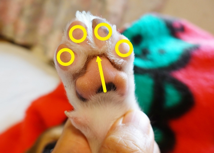 真ん中にある大きな肉球は下から上に押し上げるように、周りにある小さい肉球は優しくもみほぐす様にマッサージをしてあげましょう。滑りやすくするために肉球マッサージ用のクリームを使う事をおすすめします。