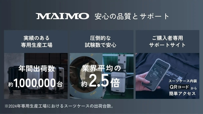 MAIMOのスーツケースは、信頼性の高い専用工場で製造されており、2024年には年間出荷数約100万台を記録しています。耐久性にもこだわり、業界平均の約2.5倍にあたる試験数を実施することで、日常から過酷な旅まで安心して使用できる品質を実現。さらに、スーツケース内装のQRコードから購入者専用のサポートサイトへ簡単にアクセスでき、アフターサポートも万全です。