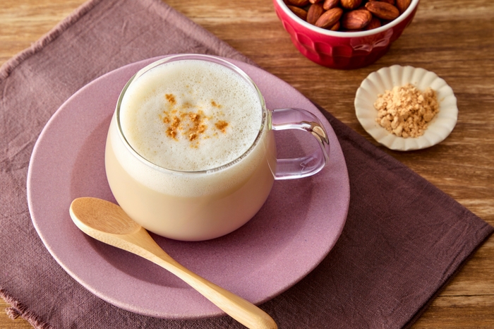 アーモンドミルクときなこの香ばしさが相性抜群◎黒糖は、はちみつに変えても美味しくいただけます。ICEで楽しむなら、黒糖を黒みつ大さじ1に変え、加熱せずに作ります。