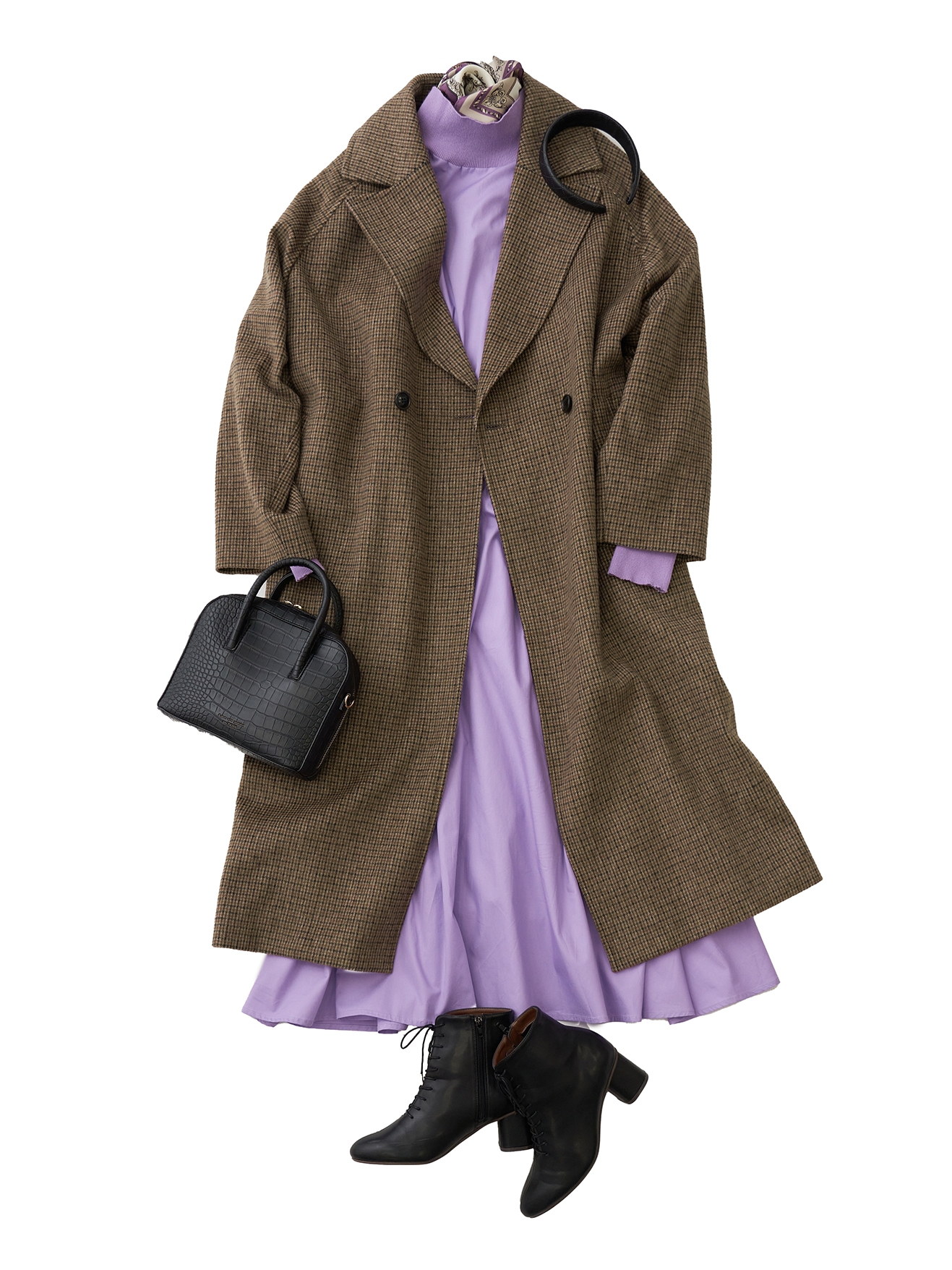 1枚でお洒落が完成するニットワンピースにはオーバーサイズのチェスターコートをサラっと羽織って。簡単におしゃれなお出かけスタイルの完成。